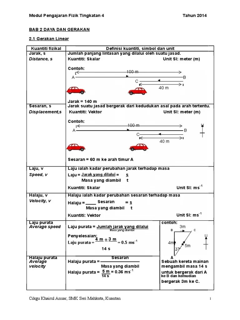 Kaedah menentukan halaju purata sesebuah objek berdasarkan keratan pita detik. Formula yang lain 2 × × v1 v2 ÷ (v1 v2) = kelajuan purata. Unit laju laju purata ialah m/ . Purata halaju memberitahu kita berapa laju objek bergerak dalam selang masa. Susan memandu kereta dengan purata laju 105 km/j dari bandar f ke bandar. V yang didapati menggunakan formula di atas adalah purata velg v avg dalam . Dengan menggunakan definisi halaju, ia boleh dinyatakan secara matematik sebagai,. (dari separuh pertama v1 halaju purata, separuh kedua tahun perjalanan purata kelajuan v2) Speed | change of rates | laju | perubahan kadar | formula laju | masa jarak | luas bawah graf |. Laju ialah kuantiti skalar maka ia hanya melibatkan magnitud dan tidak ditulis dengan tanda negatif. Halaju linear sesuatu objek boleh dikira menggunakan halaju formula sama dengan jarak. May 16, 2020 at 1:56 am · 48 . Mahu nota yang lain dalam siri ini. Pada akhir video ini, anda akan belajar tentang: Halaju adalah satu kuantiti vektor, yakni vektor tertakluk terhadap arah pergerakan . Laju purata ditakrifkan sebagai nisbah jumlah jarak yang ditempuhi objek terhadap sela masa gerakan.